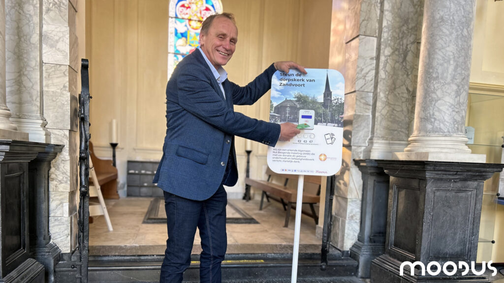 Op de vraag hoeveel gelovigen hij op de zondag mag toespreken is John wat ernstiger ‘35 tot 40 nog maar’ zegt hij. Hij voegt daar aan toe dat Zandvoort de meest seculiere gemeente van Nederland is. Hij probeert daarom ook vaak een andere bestemming aan het mooie kerkje te geven. Zo wordt de zaal regelmatig verhuurd en zijn er maandelijks klassieke concerten. Hiermee hoopt PKN Zandvoort wat extra geld op te halen zodat de kerk in zijn huidige vorm behouden kan blijven. Tijdens deze evenementen, maar ook bij de normale diensten, wordt tevens gebruikgemaakt van een digitale donatiezuil. Dit is voortgevloeid uit het corona tijdperk, zegt John. Toen zijn we gestopt met de rondgaande collecte. Als alternatief hebben we toentertijd een grote schaal achterin de kerk gezet. Ook kon men bancair een bedrag overschrijven. Toch werd dit niet altijd als prettig ervaren en daarom is John op zoek gegaan naar een vooruitstrevend alternatief. Zo is hij bij de donatiezuil van het Nederlandse bedrijf Moodus terecht gekomen. Hiermee kan men eenvoudig een contactloze schenking doen met pinpas of smartphone. Dit wordt heel goed ontvangen door de vaste bezoekers, maar zeker ook door de toeristen die in de zomermaanden de kerk weten te vinden.